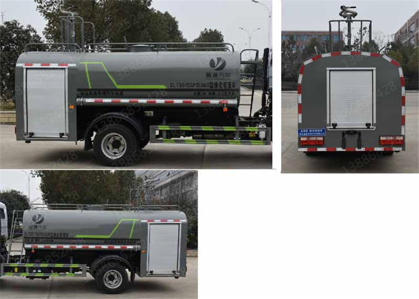 該車主要用于城鄉園林綠化噴灑,噴藥;主要裝置為罐體及噴霧裝置;罐體總容量:3.8立方米,罐體有效容積:3.62立方米,罐體外形尺寸(×長軸×短軸)(mm):2860×1760×1100;ABS型號/廠家:ABS/ASR-12V-4S/4M/襄陽東風隆誠機械有限責任公司;側、后防護材料均為:Q235碳鋼,連接方式均為:螺栓連接,后部防護截面尺寸(mm):120×50,后部防護離地高度(mm):430.隨底盤選裝駕駛室,選裝燃油箱,電瓶,尿素罐,儲氣筒左右安裝位置.選裝噴霧裝置樣式,選裝罐體左右側及后部樣式時,后防護為專用裝置代替,離地高度為430mm
