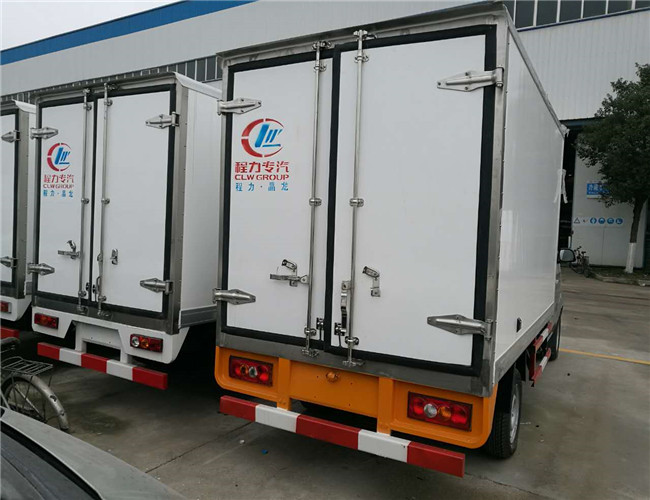 冷藏車廂體:采用國標A級聚氨酯保溫材料,厚度為8厘米,廂體內外采用玻璃鋼材質全包裹。不銹鋼鎖件。包角、包邊鋁合金型材。底盤采用高強度花紋鋁板定制。可選裝肉鉤導軌,和底部通風槽